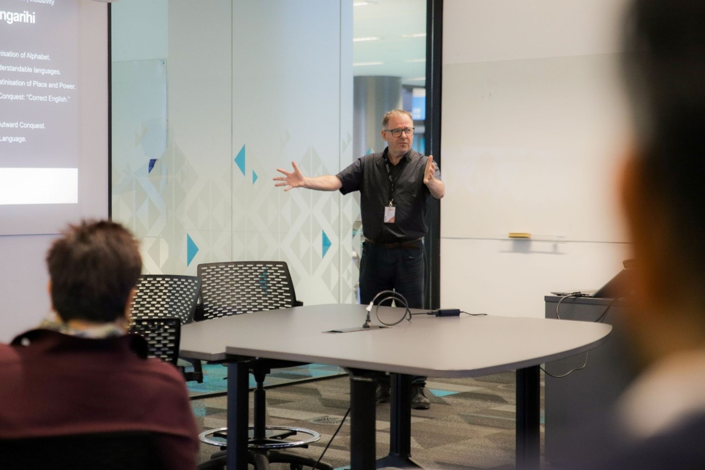 Mr McCurdy began by going back over the whakapapa (lineage) of English, demonstrating that it is a language that he says has been colonised by history.
